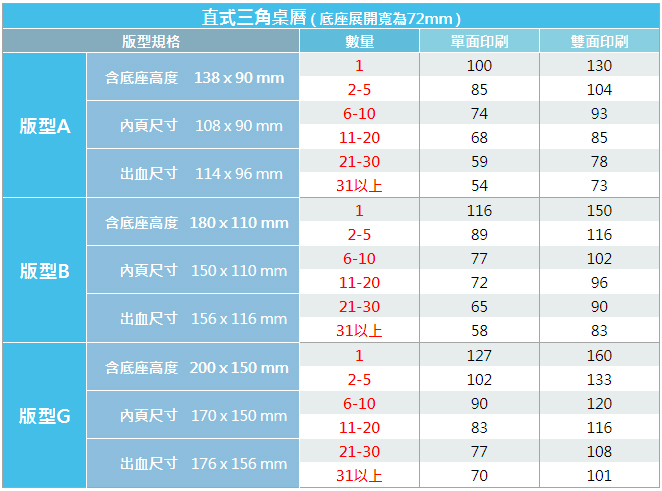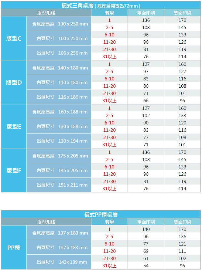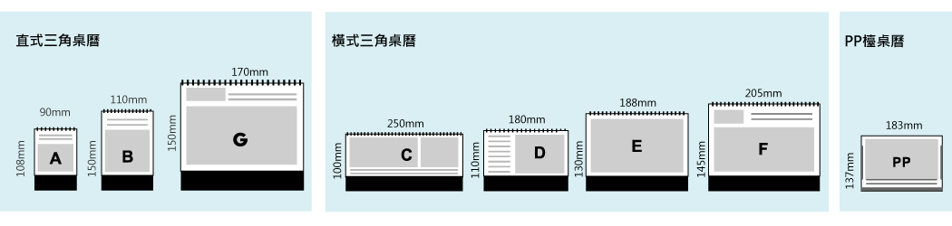 * 桌曆使用紙張材質為銅西卡200g,底版顏色為霧面黑/亮面白兩種擇一,預設為霧面黑。 * 三角桌曆裝訂均使用黑色線圈。PP檯桌曆內頁不用裝訂,桌檯為藍/綠/黃三色隨機出貨。 * 重要印刷文字請離線圈裝訂邊10mm以上,避開打孔位置。 * 三角桌曆版型請點選 A / B / C / D / E / F 下載。 * PP檯桌曆版型請直接點選下載。 * 印製工作天數需約6-8天,若量大交期日順延。