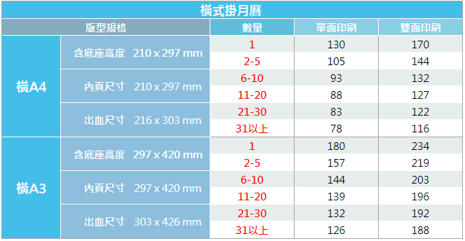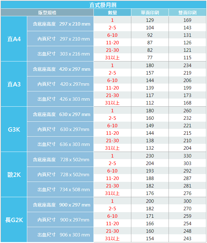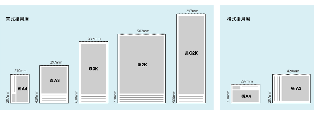 * 使用紙張材質為銅西卡200g,底版顏色為霧面黑/亮面白兩種擇一,預設為霧面黑。 * 重要印刷文字請離線圈裝訂邊10mm以上,避開打孔位置。 * 直式掛月曆版型:直A4 / 直A3 / G3K / 歐2K / 長G2K * 橫式掛月曆版型:橫A4 / 橫A3 * 印製工作天數需約6-8天,若量大交期日順延。