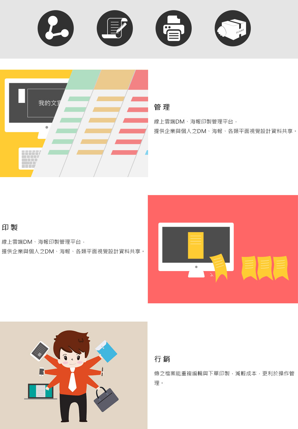 線上雲端DM、海報印製管理平台,提供企業與個人之DM、海報、各類平面視覺設計資料共享,整合印刷廠雲端印製技術,優質設計、快速出貨;同時提供會員稿件留存管理系統,上傳之檔案能重複編輯與下單印製,減輕成本,更利於操作管理。