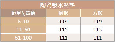 * 吸水杯墊需最低印製數量為5個,圓形杯墊尺寸為110x110mm,方型尺寸為100x100m,厚度為6mm,材質為白色。