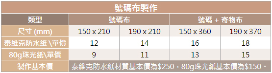 * 號碼布兩種材質均有製作基本價,泰維克防水紙材質基本價為$250,80g珠光紙基本價為$150。